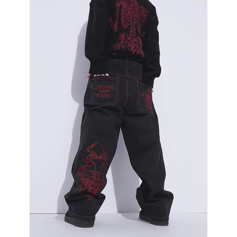 Men's Skeleton Embroidery Jeans, Casual Street Style Loose Fit Jeans, Halloween Gift