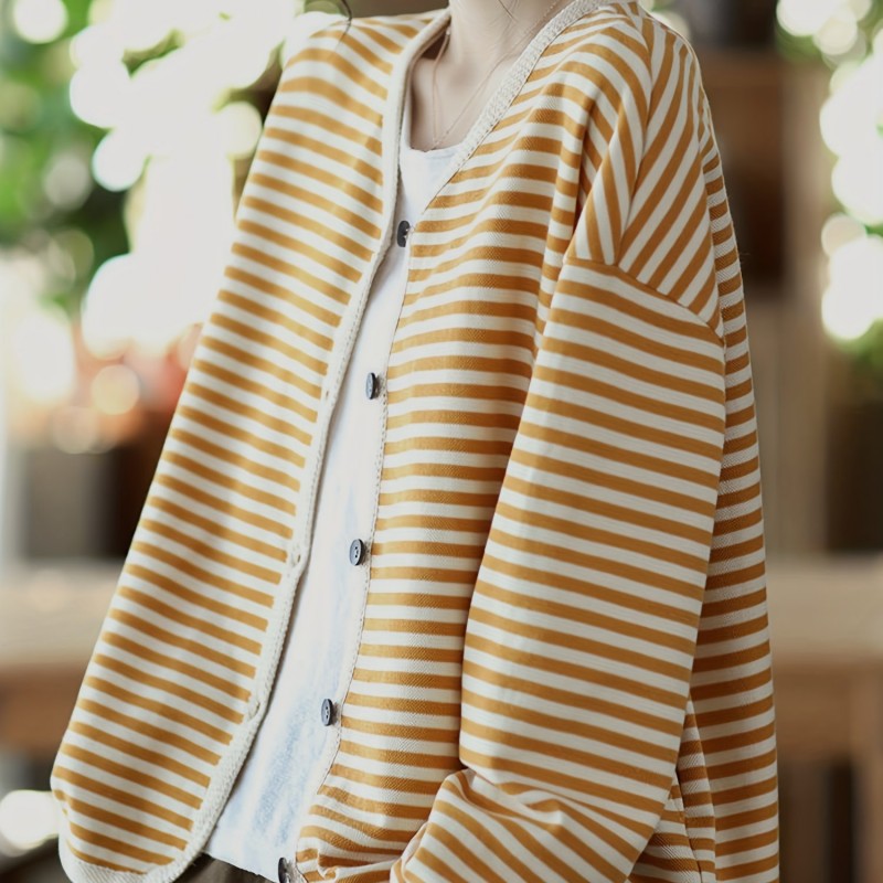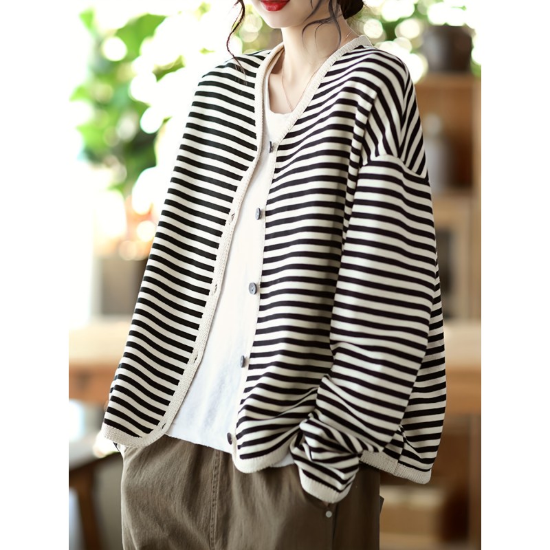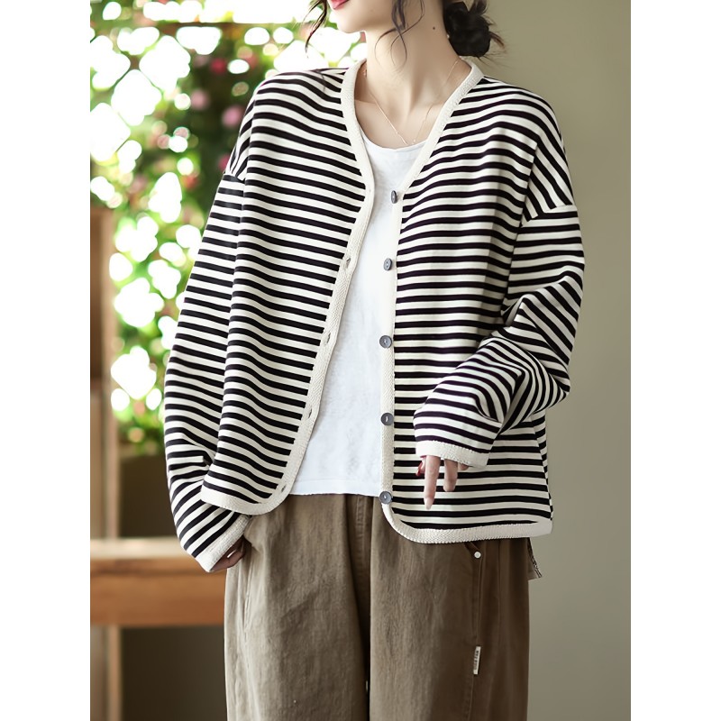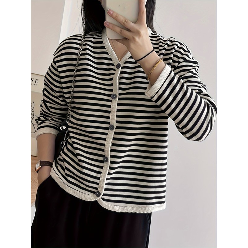 Striped Print Button Front Jacket, Casual V Neck Long Sleeve Outerwear For Spring & Summer, Women's Clothing