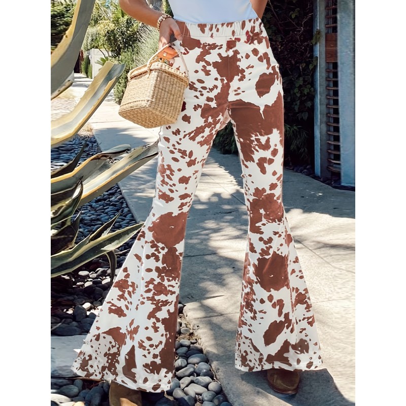 Cow Print Flare Leg Ankle Pants, Elegant Elastic Waist Slim Pants, Women's Clothing