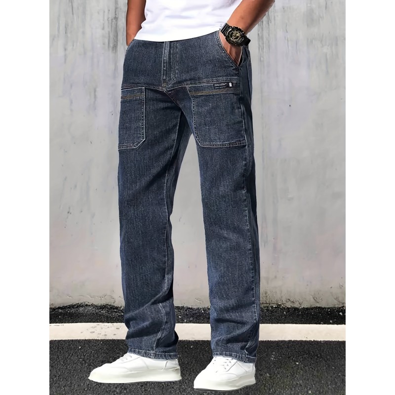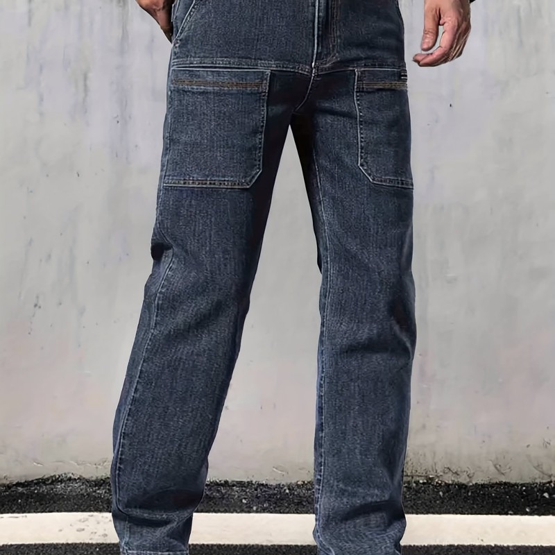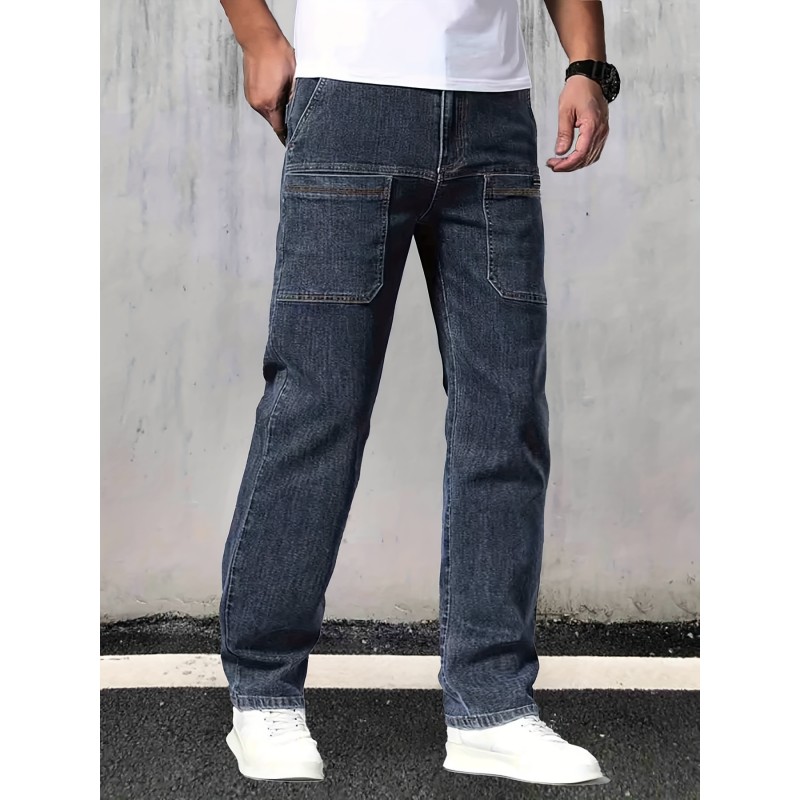 Loose Fit Straight Leg Jeans, Men's Casual Street Style Multi Pocket Denim Pants For All Seasons