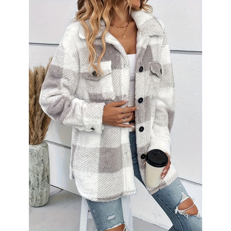 Plaid Fuzzy Fall & Winter Jacket, Casual Button Front Long Sleeve Outerwear, Women's Clothing