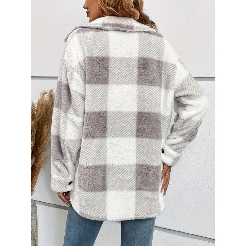 plaid fuzzy fall winter jacket casual button front long sleeve outerwear womens clothing details 1